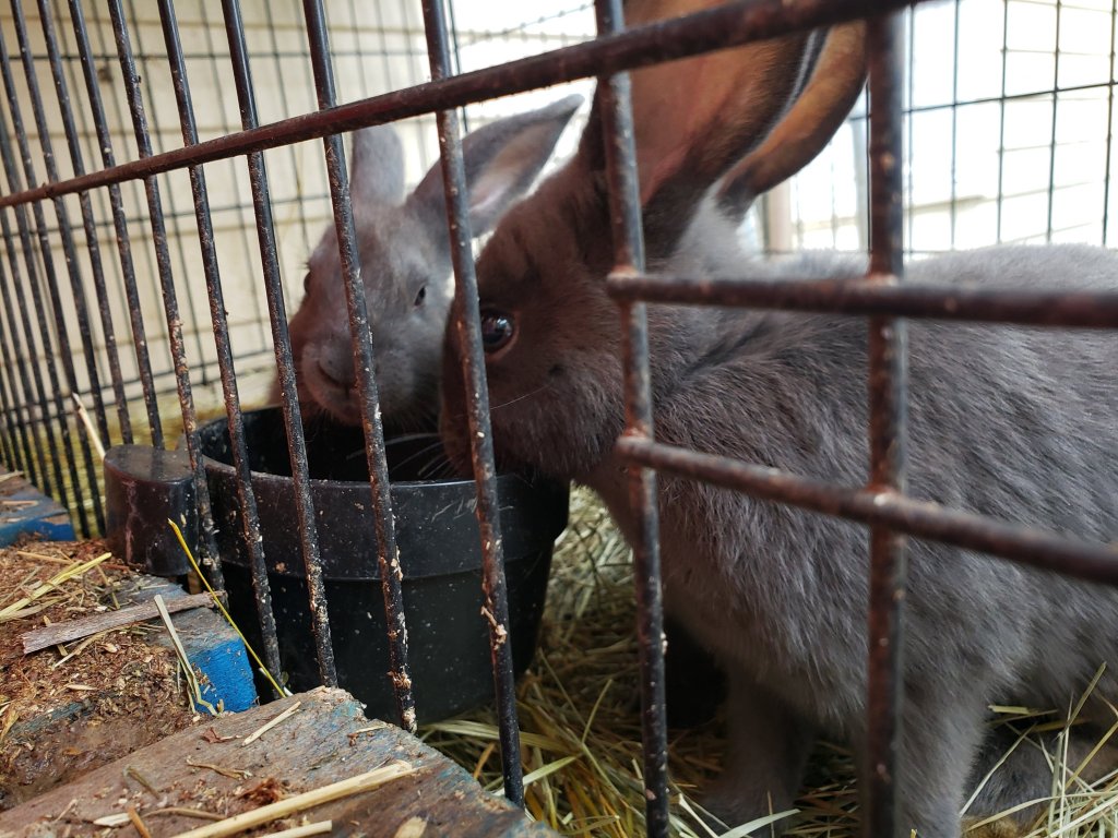 Each rabbit cage gets fresh cold water and 2 handfuls of feed. They get dandelion and narrowleaf plantain as treats every morning. I use these to help maintain good digestion and also build their immune systems as they are 9 and 11 weeks old.