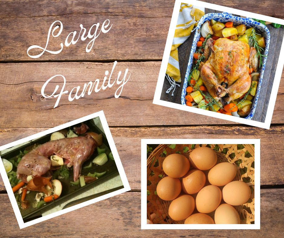 This box is perfect for the small family who likes to change things up a bit. Each rabbit will provide 3+ lbs of meat which makes them perfect for smaller meals. Chickens are 5+ lbs which are great for larger meals or those times when you want to make multiple meals at once. Eggs are collected daily and are counter-safe for up to 1 month.